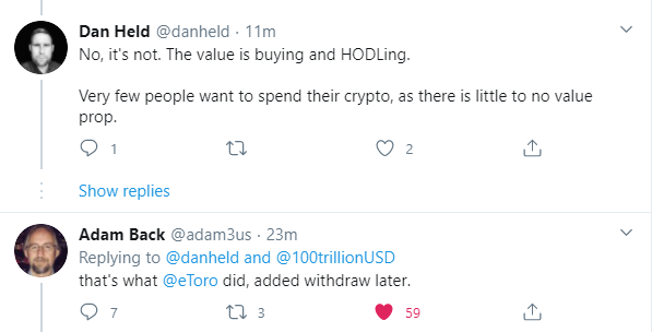 블록스트림(Blockstream)의 공동창업자 애덤 백(Adam Back)은 거래소 이토로(eToro)의행동과 정확하게 일치한다고 강조하며 추후 철수한 바 있다고 덧붙였다.