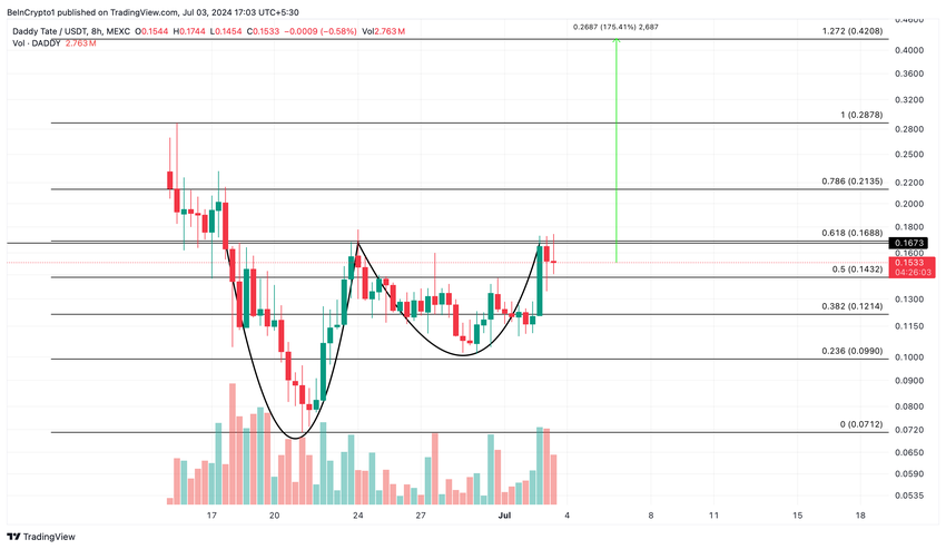 현재 이 패턴의 네크라인은 $0.1673입니다. 이 레벨은 고점 0.2878달러에서 저점 0.0712달러까지 그려진 0.618 피보나치 되돌림 레벨과 거의 일치합니다.