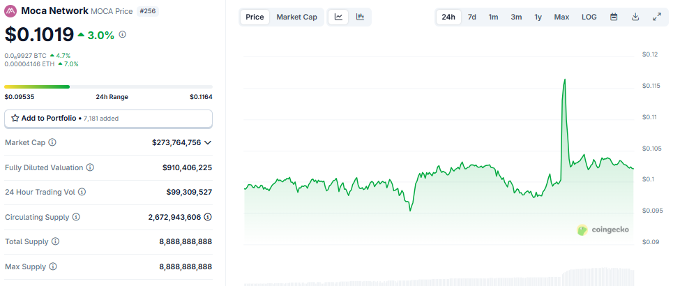 코인게코(CoinGecko) 데이터에 따르면, MOCA 토큰은 이 소식으로 3% 상승하여 보도 시점에 0.1019달러에 거래되고 있습니다.