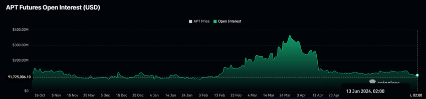 앱토스는 미청산 약정에서 알 수 있듯이투자자들이 지지를 철회하고 있습니다. 미결제약정은 옵션이나 선물과 같이 결제되지 않은 미체결 파생상품 계약의 총 수입니다. 이는 시장 활동과 유동성을 나타내는 주요 지표로, 시장에 유입되는 자금의 흐름을 반영합니다.
