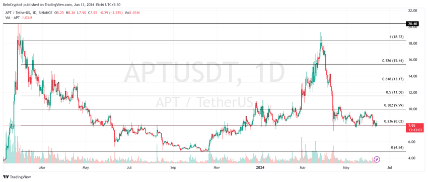 이 글을 쓰는 시점에 7.95달러에 거래되는 앱토스 가격은 23.6% 피보나치 되돌림인 8.02달러 바로 아래에 있습니다. 이 기술적 수준은 약세장 지지선이라고도 합니다. 그 아래로 하락하면 약세의 신호이며 잠재적인 하락을 나타냅니다.