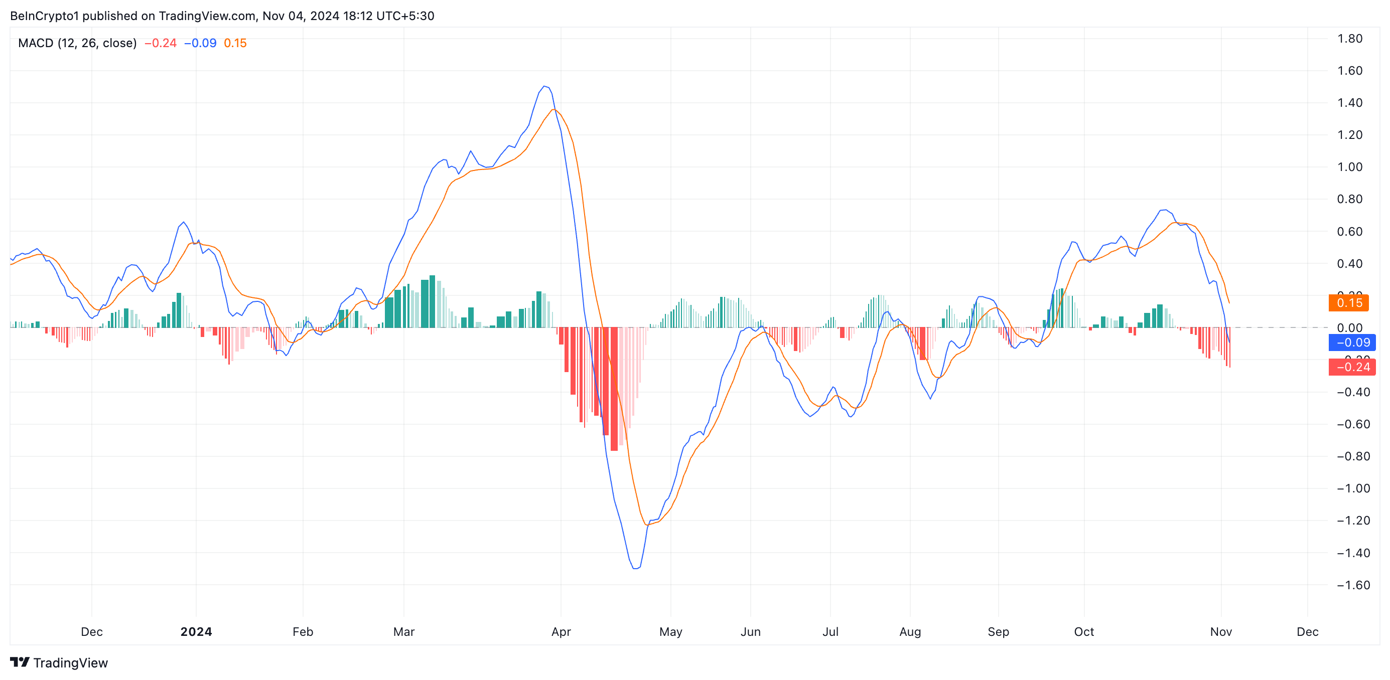 APT의 이동 평균 수렴/발산(MACD) 설정은 하락 전망을 강화합니다. 현재 MACD 선(파란색)은 신호 선(주황색)과 제로 선 모두 아래에 위치하고 있습니다.