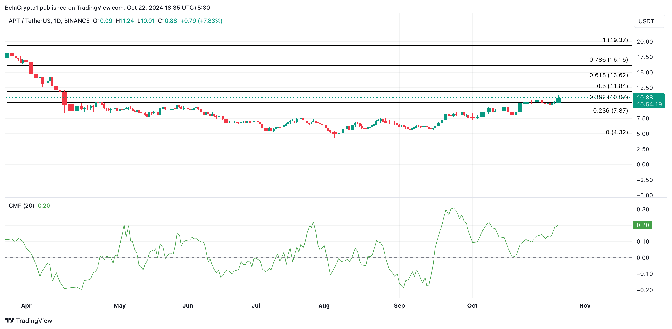 BeInCrypto의 코인 주요 모멘텀 지표 평가는 랠리가 지속될 가능성을 시사합니다. 예를 들어, APT의 차이킨 머니 플로우(CMF)도 가격과 함께 상승 추세를 보이며 현재 제로 라인 위에서 0.20에 위치하고 있습니다.