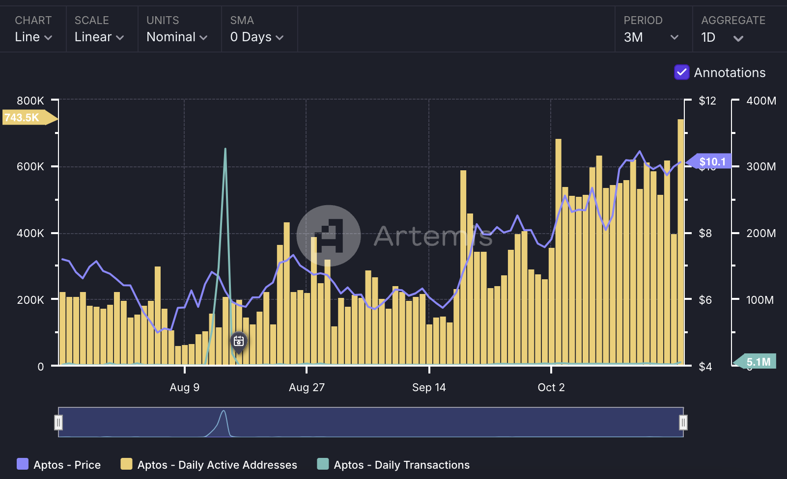 온체인 데이터는 지난 한 달 동안 앱토스에서의 사용자 활동이 눈에 띄게 증가했습니다. 블록체인 데이터 기업 아르테미스(Artemis)에 따르면, 지난 30일 동안 블록체인에서 최소 한 번의 거래를 완료한 고유 주소의 일일 수가 115% 급증했습니다. 검토 기간 동안 앱토스의 일일 활성 주소는 총 743만 466개였습니다.