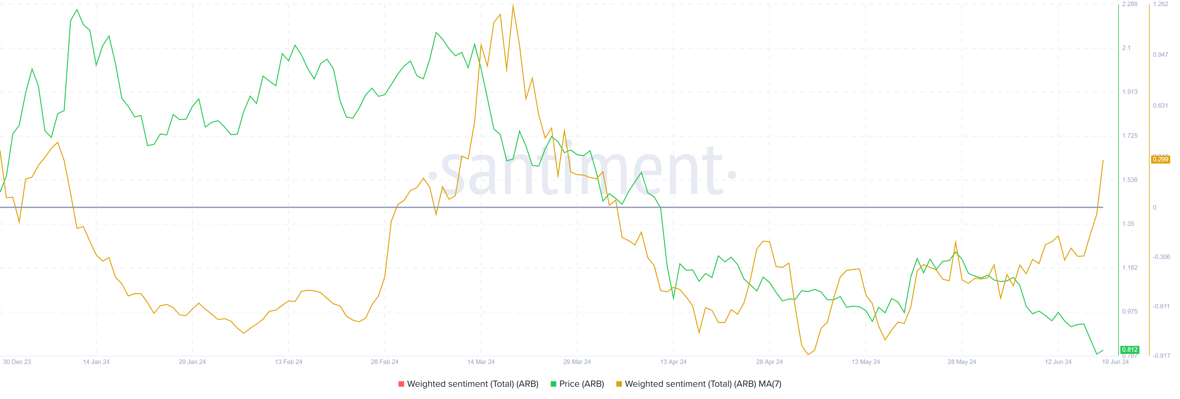 3개월 만에 처음으로 이 감정은 아비트럼에 대해 긍정적입니다. 투자자들의 옵티미즘이 높아지면 가격도 상승할 수 있습니다.