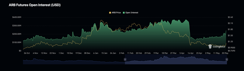 ARB에 대한 시장 관심의 급증은 선물 미결제약정 증가로 나타났습니다. 따라서 2억 4,300만 달러로 지난 24시간 동안 토큰의 선물 미결제 약정이 19% 증가했습니다.