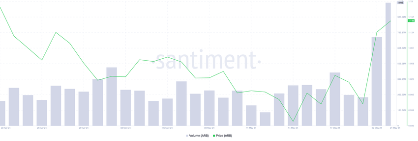 지난 24시간 동안ARB에 대한 활동이 증가하면서 토큰의 거래량이 크게 증가했습니다. 보도 시점에 총 10억 4천만 달러에 달하는 이 토큰의 거래량은 현재 3월 21일 이후 하루 최고 수준입니다.