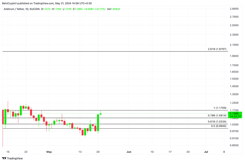 ARB 가격은 저항선인 1.13달러를 넘어섰을 뿐만 아니라 20일 지수이동평균(EMA)과 50일 소형이동평균(SMA)을 상회하고 있습니다.