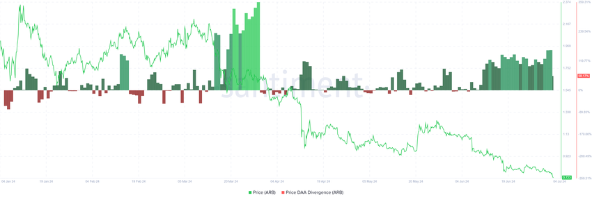 아비트럼의 가격이 사상 최저치를 기록했고, 이는 투자자들을 낙담하게 만들었습니다. 그럼에도 불구하고 네트워크 참여는 꾸준히 높은 수준을 유지하고 있습니다. 그 결과 현재 일일 활성 주소(DAA) 가격 다이버전스가 매수 신호를 깜박이고 있습니다.