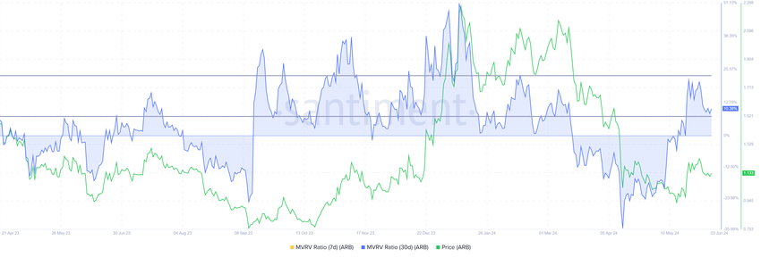 MVRV 비율은 투자자의 수익 또는 손실을 평가합니다. 아비트럼의 30일 MVRV는 10%로, 수익이 발생했다는 신호이며 잠재적으로 매도를 유도할 수 있습니다. 역사적으로 ARB 조정은 7%와 23% MVRV 범위 내에서 발생하여 위험 구간으로 분류됩니다.