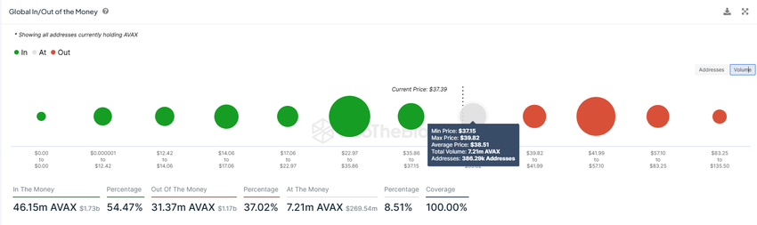 또한 아발란체의 가격은 37달러에서 41달러 사이의 주요 저항에 직면해 있습니다. 이는 글로벌 인/아웃 오브 더 머니(GIOM) 지표에 따르면, 이 범위에서 약 4억 970만 달러 상당의 1,190만 AVAX 보유자가 매수했기 때문입니다.