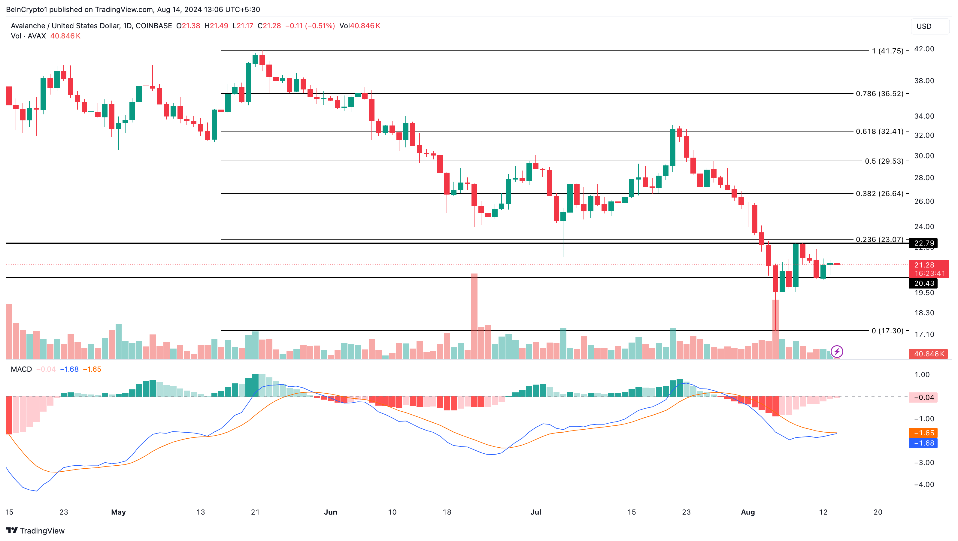 보도 시점에 AVAX는 21.27달러에 거래되고 있으며 지난 며칠 동안 같은 구간에서 맴돌고 있습니다. 박스권 일일 차트에서 볼 수 있듯이 8월 8일 토큰은 잠시 20달러 아래로 떨어졌습니다.