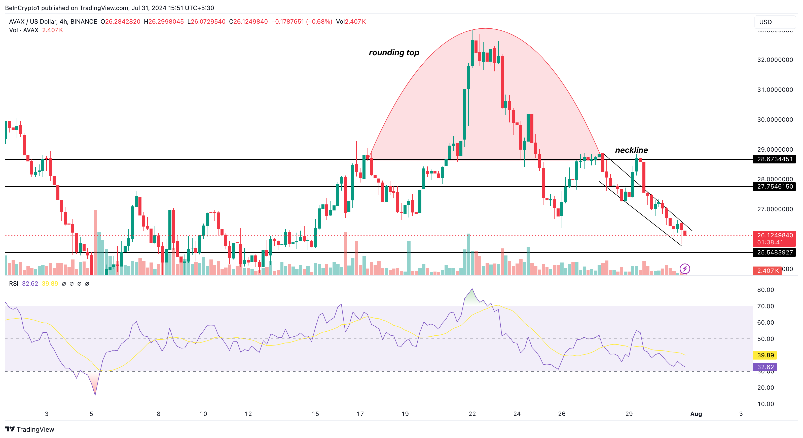 일일 AVAX/USD 차트는 토큰이 약세로 마감할 수 있음을 보여줍니다. 이러한 하락은 7월 17일부터 27일 사이에 나타난 반올림 상단 패턴에 기인할 수 있습니다.
