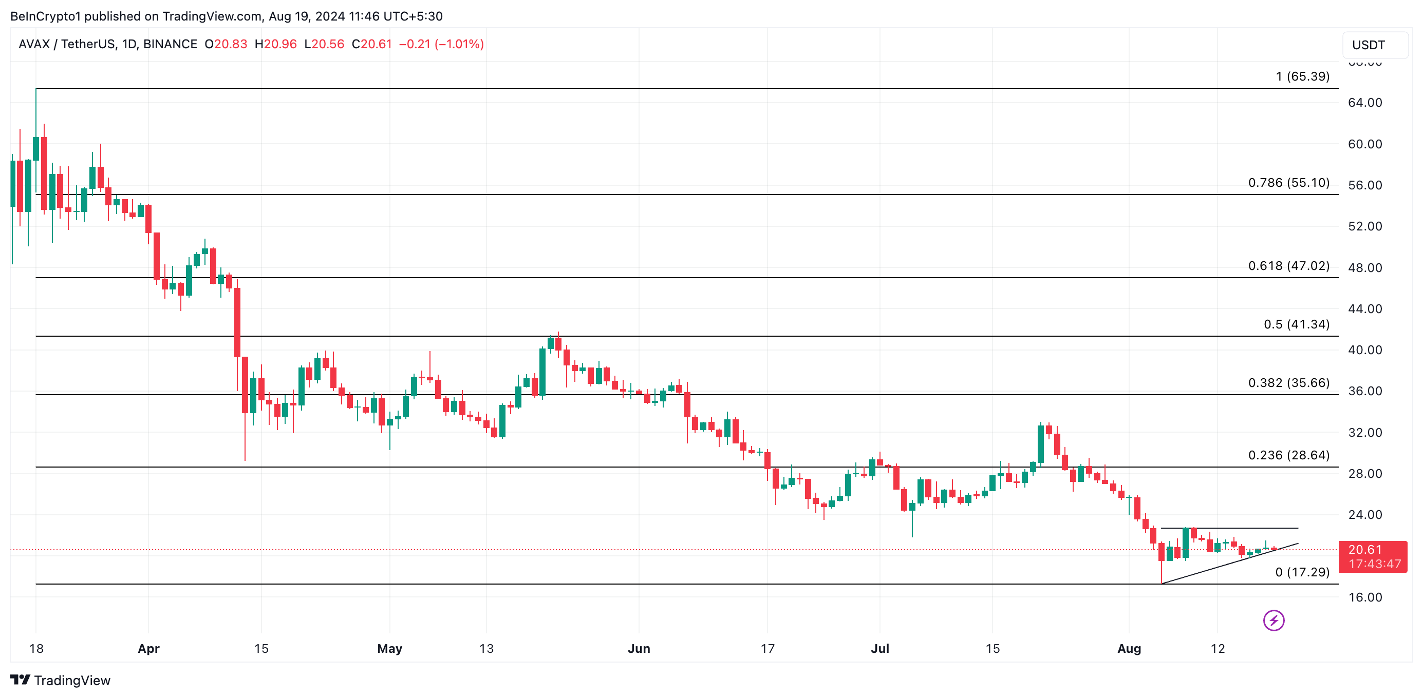 매도 압력이 심해지면 AVAX는 상승 삼각형의 지지선 아래로 하락하여 8월 5일 저점인 19.54달러를 다시 테스트할 수 있습니다.