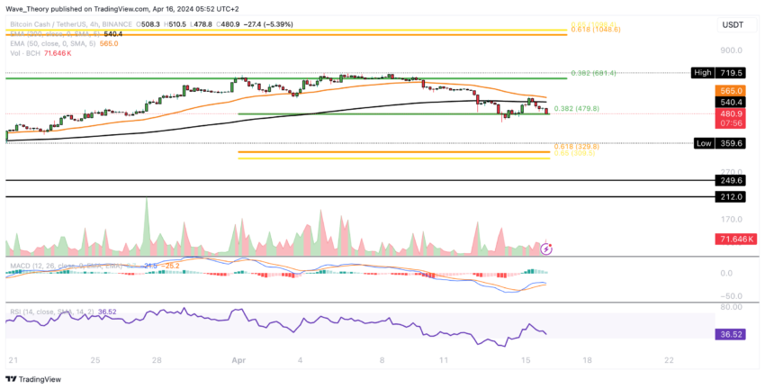 실제로 가격은 이후 38% 이상의 조정을 거쳤습니다. 현재 비트코인 캐시는 480달러 부근에서 주목할 만한 피보나치 지지선을 만나고 있습니다. 또한, 이 지지선이 흔들릴 경우 약 325달러에서 황금 비율 지지선이 형성되며, 50개월 EMA가 추가적인 지지선으로 작용할 수 있습니다.