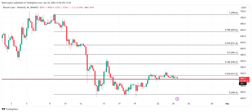 비트코인 캐시의 거래 가격 504달러는 현재 513달러의 저항선을 돌파하는 데 어려움을 겪고 있습니다. 이 수준은 23.6% 피보나치 되돌림인 709달러에서 452달러와 맞닿아 있기 때문에 중요한 의미를 갖습니다.