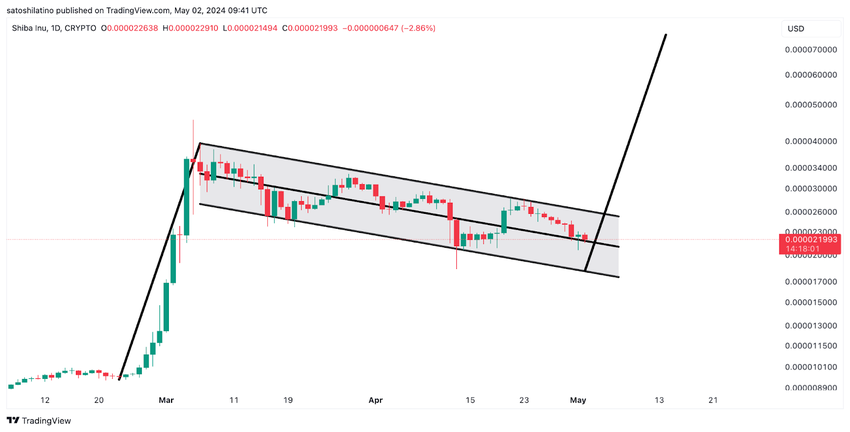 이러한 실수에도 불구하고 기술적 분석은 시바이누에 대한 잠재적 강세 신호를 시사합니다. SHIB의 일봉 차트에서 황소 깃발이 형성된 것은 상승 가능성을 암시합니다.