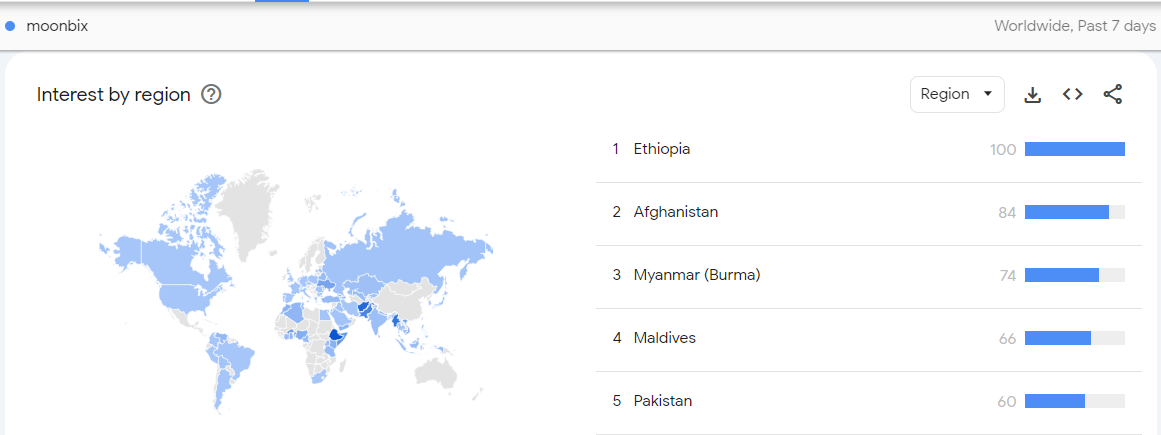 구글 트렌드 데이터에 따르면, 에티오피아가 문빅스 관련 검색에서 세계를 선도합니다. 이 나라의 강력한 관심이 아프가니스탄, 미얀마, 몰디브, 파키스탄과 같은 다른 국가들을 앞서게 했습니다.