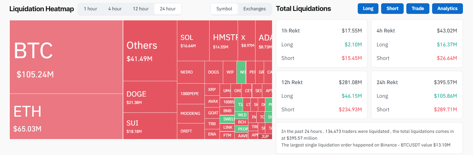 시장 하락을 예상하던 공매도자들은 약 2억 8천 8백 46만 달러의 가장 큰 손실을 보았습니다. 롱 트레이더들은 약 1억 560만 달러의 손실을 겪었으며, 비트코인 트레이더들은 청산에서 약 1억 500만 달러를 차지했고, 이더리움 트레이더들은 6천 5백만 달러였습니다.