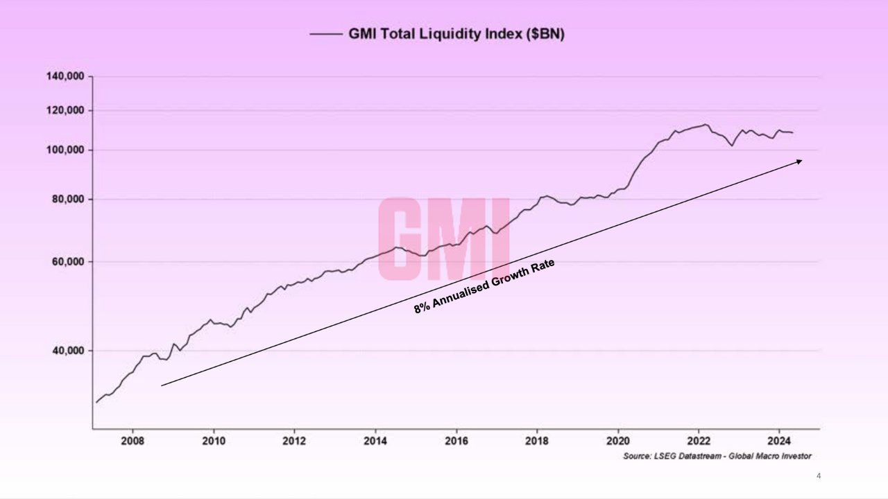 글로벌 유동성 지수는 현재 연간 8% 성장하고 있습니다. 유동성을 이해하기 위해 폴은 먼저 GDP를 이해해야 한다고 제안했습니다. 그는 GDP 성장에 대한 공식을 제시했습니다: GDP 성장 = 인구 성장 + 생산성 성장 + 부채 성장.