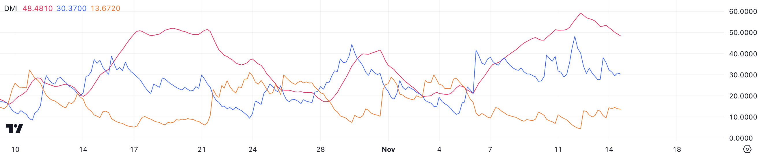BTC DMI 차트는 비트코인의 강력한 상승 추세를 강조합니다. 현재 ADX는 48로, 상당한 추세 강도를 나타냅니다. ADX는 추세의 강도를 측정하는 도구로, 25 이상은 강한 추세를, 40 이상은 매우 강한 추세를 나타냅니다.