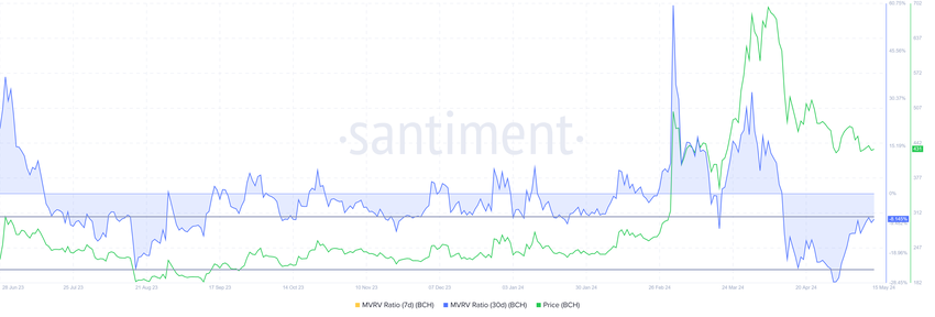 시장가치 대비 실현가치(MVRV) 비율은 여전히 0선을 밑돌고 있습니다. MVRV 비율은 투자자의 이익/손실을 추적합니다. 비트코인 캐시의 30일 MVRV가 -8.1%라는 것은 손실이 발생했음을 의미하며, 손실이 누적될 수 있음을 시사합니다. 역사적으로 비트코인캐시는 -6%와 -24%의 MVRV 수준에서 조정을 받아왔으며, 이는 축적 기회 구간으로 분류됩니다.