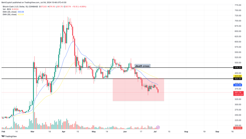 결과적으로 비트코인 캐시 상승세는 423.30 달러의 지지선을 방어하지 못했습니다. 또한 가격은 두 EMA 아래에서 거래되고 있어 추가 하락이 있을 수 있음을 나타냅니다.