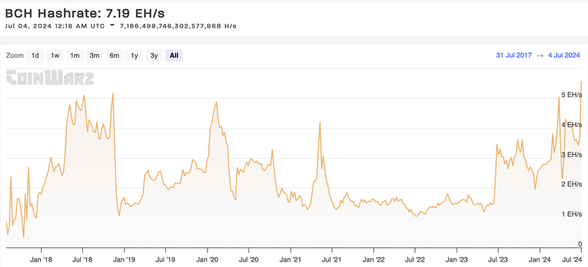 해시레이트는 작업 증명(PoW) 합의 메커니즘을 사용하는 암호화폐 프로젝트에서 중요한 요소입니다. 비트코인(BTC)이 이 체제를 주도하고 있는 가운데, 2017년 하드포크된 비트코인 캐시(BCH)의 해시레이트가 7월 3일에 급등했습니다.