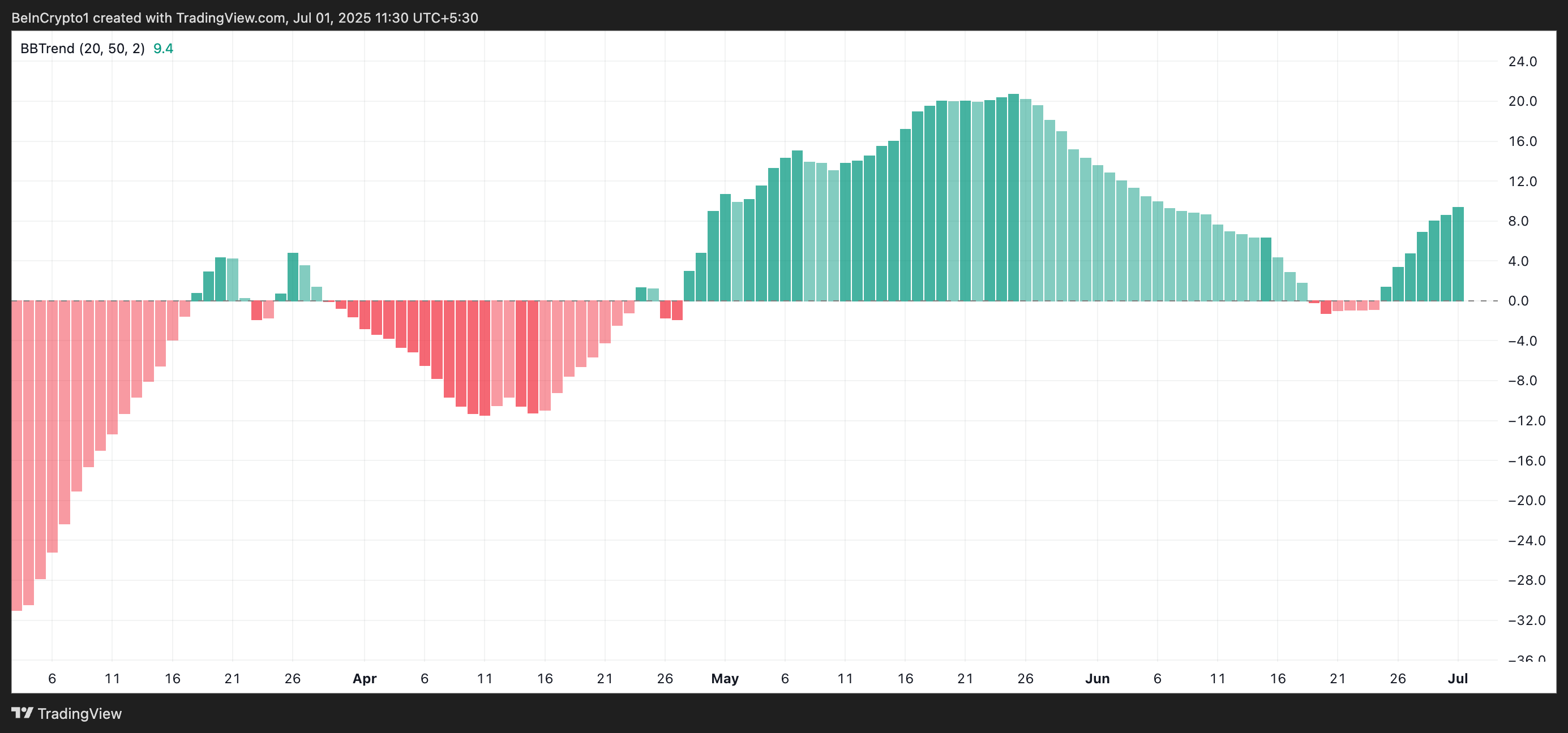 BBTrend는 볼린저 밴드의 확장과 수축을 기반으로 추세의 강도와 방향을 측정합니다. 지표가 연속적인 세션에서 더 큰 녹색 히스토그램 막대를 인쇄할 때, 이는 강세 추세가 강화되고 있음을 시사합니다.