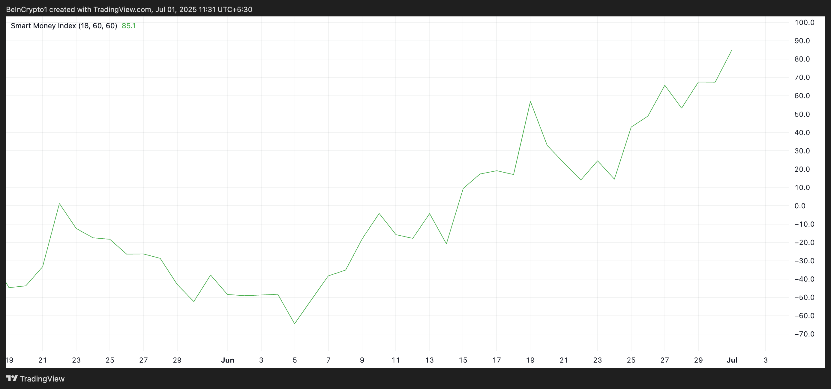 더욱이, 코인의 스마트 머니 지수(SMI)는 이러한 강세 전망을 뒷받침합니다. 작성 시점에 이 지표는 85.1에 있으며, 6월 5일 이후 220% 이상 상승했습니다.