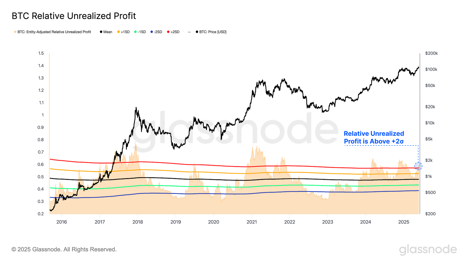 현재 비트코인의 시장 심리는 투자자들의 낙관론에 의해 주도되고 있습니다. 미실현 이익이 +2 표준편차(SD) 임계값을 초과하여 비트코인이 열광적인 단계에 진입하고 있음을 나타냅니다. 역사적으로 미실현 이익이 이 임계값을 넘을 때마다 비트코인은 단기적으로 가격이 급등한 후 급격한 조정을 겪습니다.