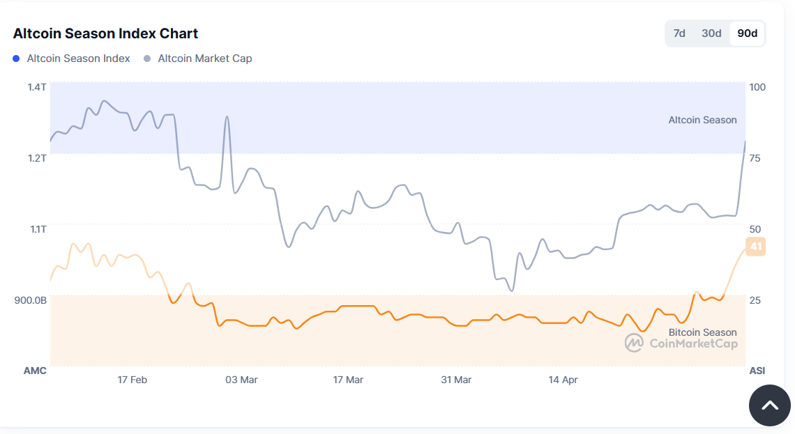 한편, 코인마켓캡의 알트코인 시즌 지수 데이터에 따르면 지수가 두 달 만에 최고치인 41에 도달했습니다. 여전히 알트코인 시즌을 정의하는 75포인트 임계값에는 미치지 못하지만, 지표는 “비트코인 시즌” 영역을 벗어나 중립 영역에 진입하여 긍정적인 감정의 회복을 나타냅니다.