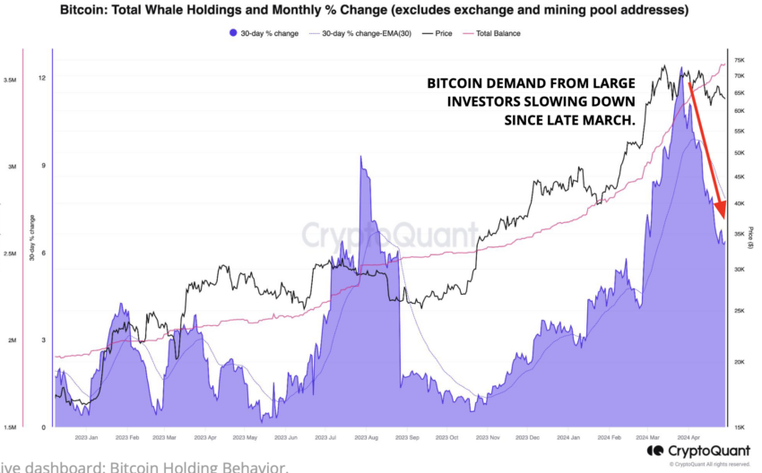마찬가지로 흔히 ‘암호화폐 고래’라고 불리는 대형 투자자들의 수요도 둔화세를 보이고 있습니다. 일반적으로 1,000~10,000 BTC를 보유하고 있는 이 투자자들은 3월에 수요 증가율이 12%에 달했습니다. 하지만 현재 6%로 반토막이 난 상황입니다.