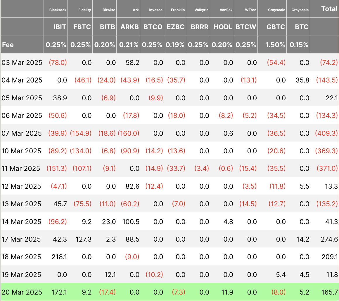 최신 데이터에 따르면, 3월 20일 일일 총 순유입액은 1억6570만 달러에 달했습니다. 그러나 이 성장은 11개의 ETF에 걸쳐 고르지 않았습니다.