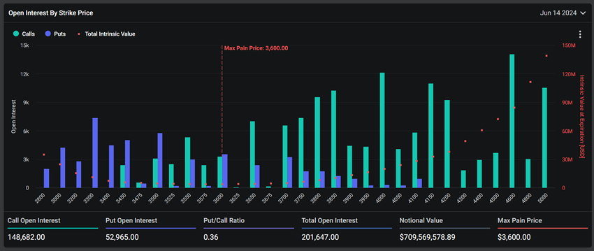 또한 201,647개의 이더리움 계약이 동시에 만료됩니다. 데리비트의 데이터에 따르면 이들 계약의 명목 가치는 7억 9,976만 달러이며, 최대 고통 지점은 3,600달러입니다. 또한 데이터에 따르면 이 옵션의 풋-콜 비율은 0.36입니다.