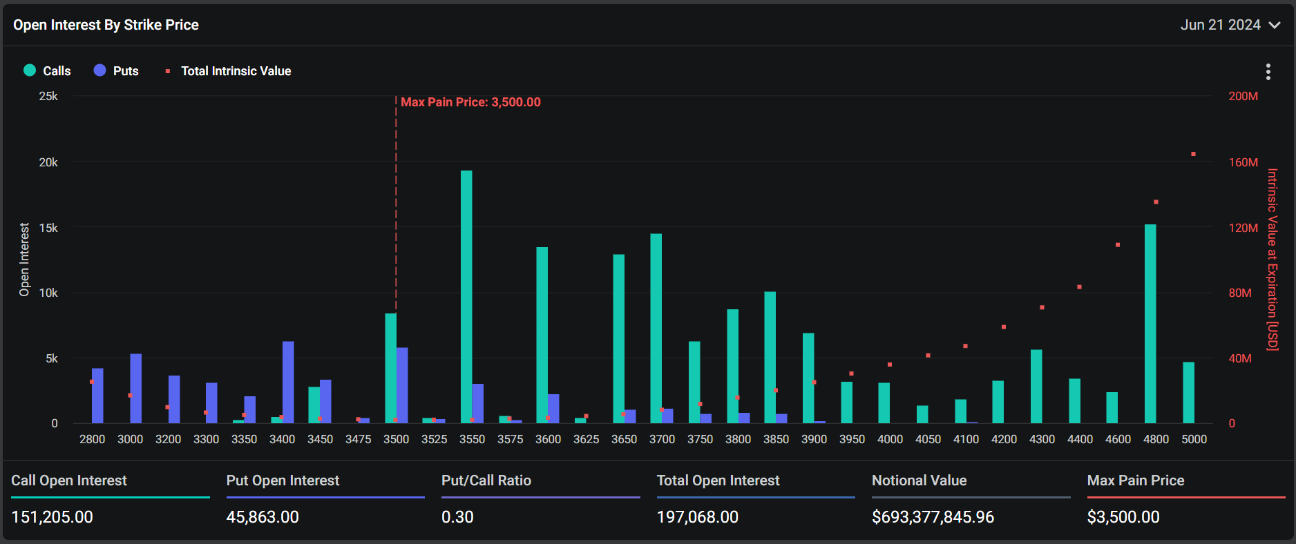 반면 이더리움에는 19만7068개의 계약이 있으며 명목 가치는 6억9337만 달러에 달합니다. 이러한 만기 계약의 풋-콜 비율은 0.30이고 최대 고통지점은 3500달러입니다.