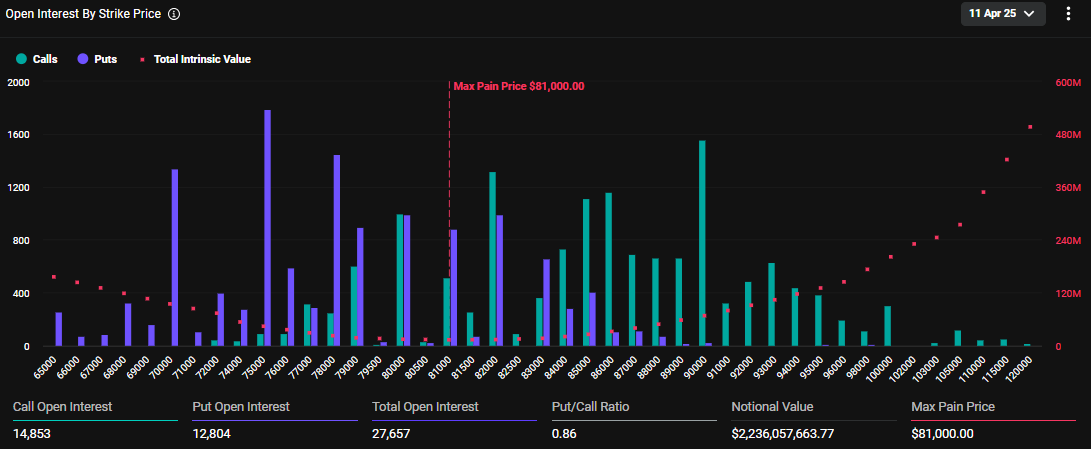 데이터는 또한 이 만료되는 옵션의 최대 고통 지점이 8만1000달러임을 보여줍니다. 암호화폐 옵션 거래에서 최대 고통 지점은 대부분의 계약이 무가치하게 만료되는 가격입니다. 여기서 자산은 가장 많은 보유자의 재정적 손실을 초래합니다.