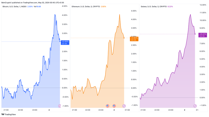 비트코인, 이더리움, 솔라나는 연방공개시장위원회 회의에서 파월 의장의 발언과 맞물려 큰 폭의 가격 상승을 보였습니다.