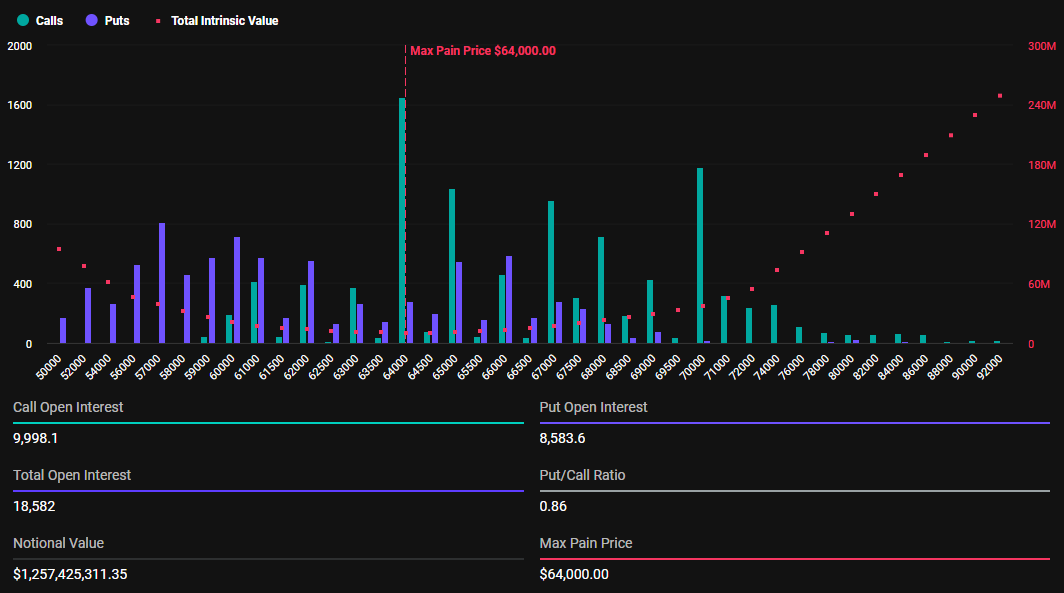 데리빗에 따르면, 오늘 만기가 도래하는 비트코인 옵션은 1만8583개로, 지난주에 소멸된 1만8271개 계약보다 약간 많습니다. 오늘 만기가 도래하는 옵션 계약은 풋-투-콜 비율이 0.86이며, 참여자들이 가장 큰 손해를 보는 ‘맥스 페인(Max Pain)’ 지점은 6만4000달러입니다.