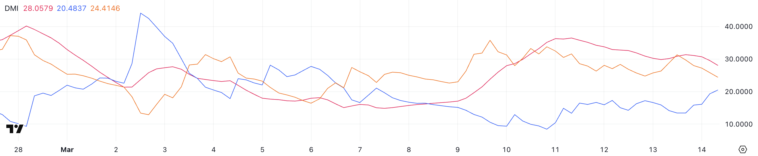 비트코인의 방향성 이동 지수(DMI)는 평균 방향성 지수(ADX)가 31에서 28로 약간 감소했음을 보여주며, 이는 추세 강도가 약화되고 있음을 나타냅니다.