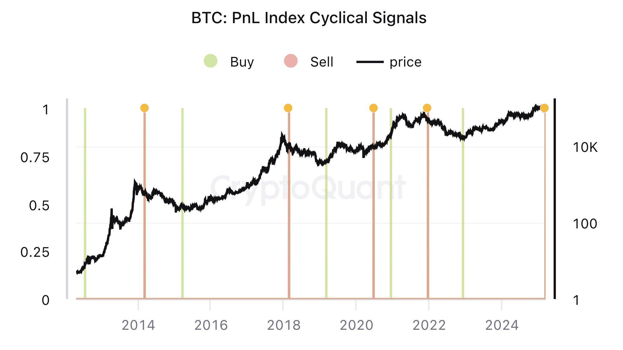 비트코인 명목 수요와 함께, 크립토퀀트 창립자 기영주도 비트코인 PnL 지수 주기적 신호를 분석했습니다. 이 지표는 MVRV, SOPR, NUPL과 같은 주요 온체인 데이터를 365일 이동평균으로 적용합니다. 이는 단기 변동이 아닌 대규모 사이클의 주요 전환점에서 “매수” 또는 “매도” 신호를 제공합니다.