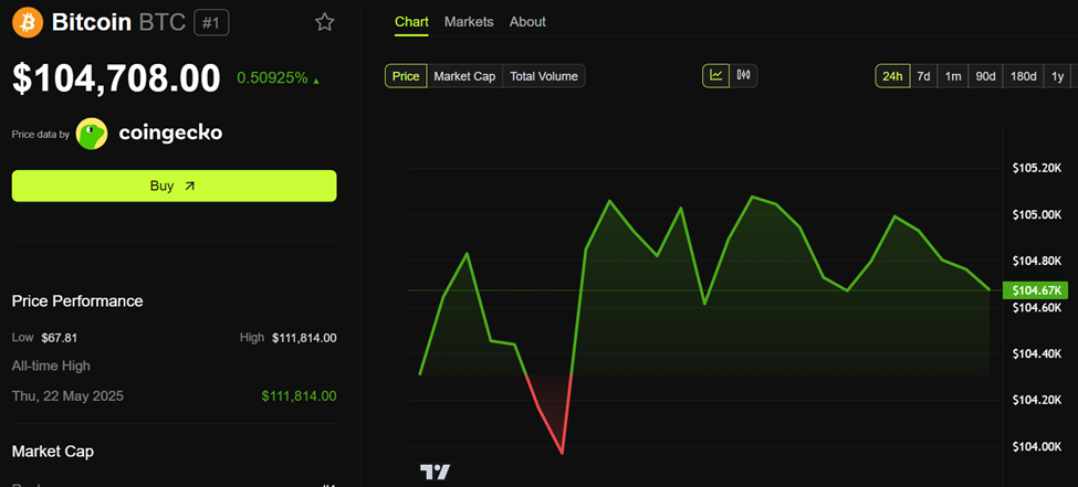 이 글을 쓰는 시점에서 비트코인은 104,708달러에 거래되고 있으며, 지난 24시간 동안 0.5% 소폭 상승했습니다.