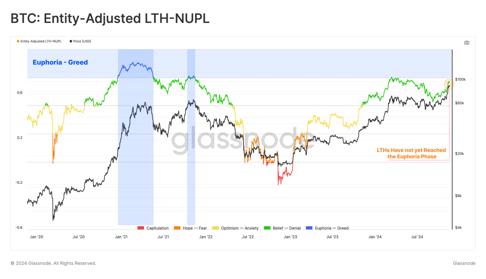 장기 보유자 순 미실현 이익/손실(LTH NUPL) 지표는 여전히 유포리아 임계값 아래에 있습니다. 이는 성장 여지가 더 있음을 시사합니다. 역사적으로 LTH가 유포리아의 정점에 도달하지 않고 상당한 미실현 이익을 보유할 때 시장은 추가 상승 가능성을 보였습니다.