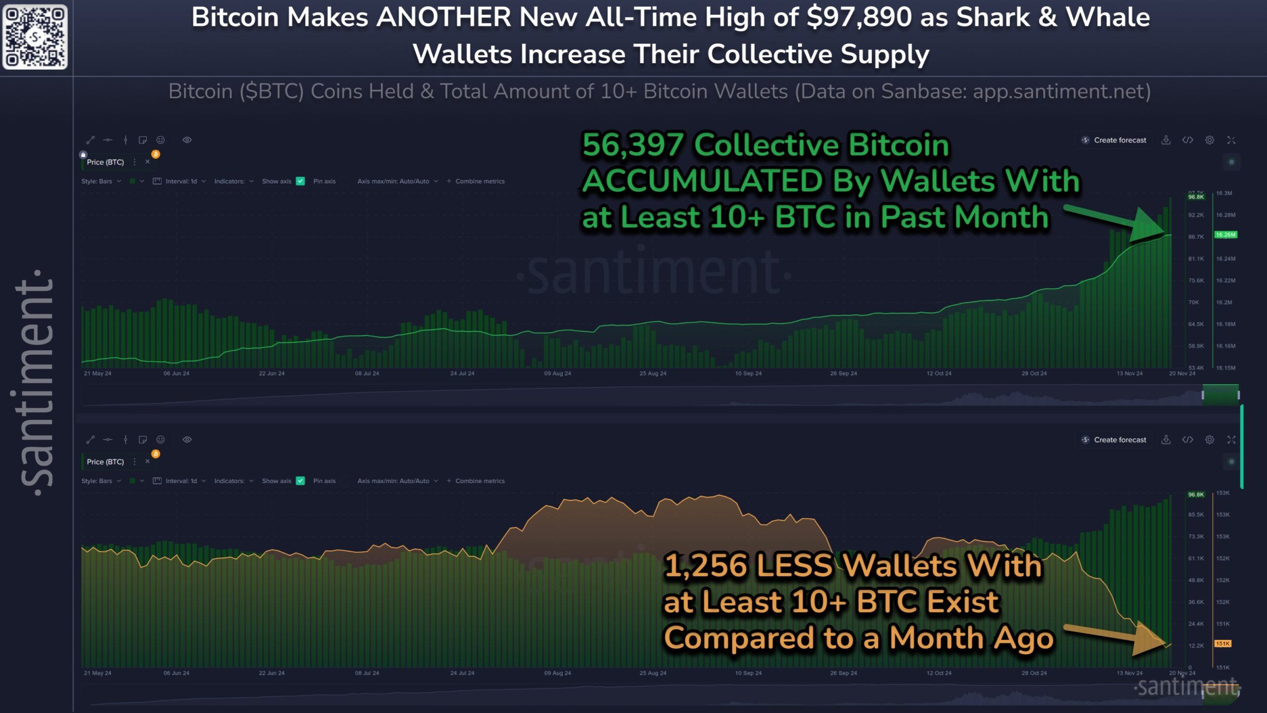 비트코인 고래 투자자들은 지난 한 달 동안 꾸준히 비트코인을 축적하며 약 54억2000만 달러 상당의 5만6397 BTC를 추가했습니다. 이러한 지속적인 매수 압력은 비트코인의 가격 움직임을 크게 지지하며 새로운 최고가로 이끌었습니다. 고래 활동은 시장 동향에 영향을 미치는 대규모 투자자들이기 때문에 상승 신호로 간주됩니다.