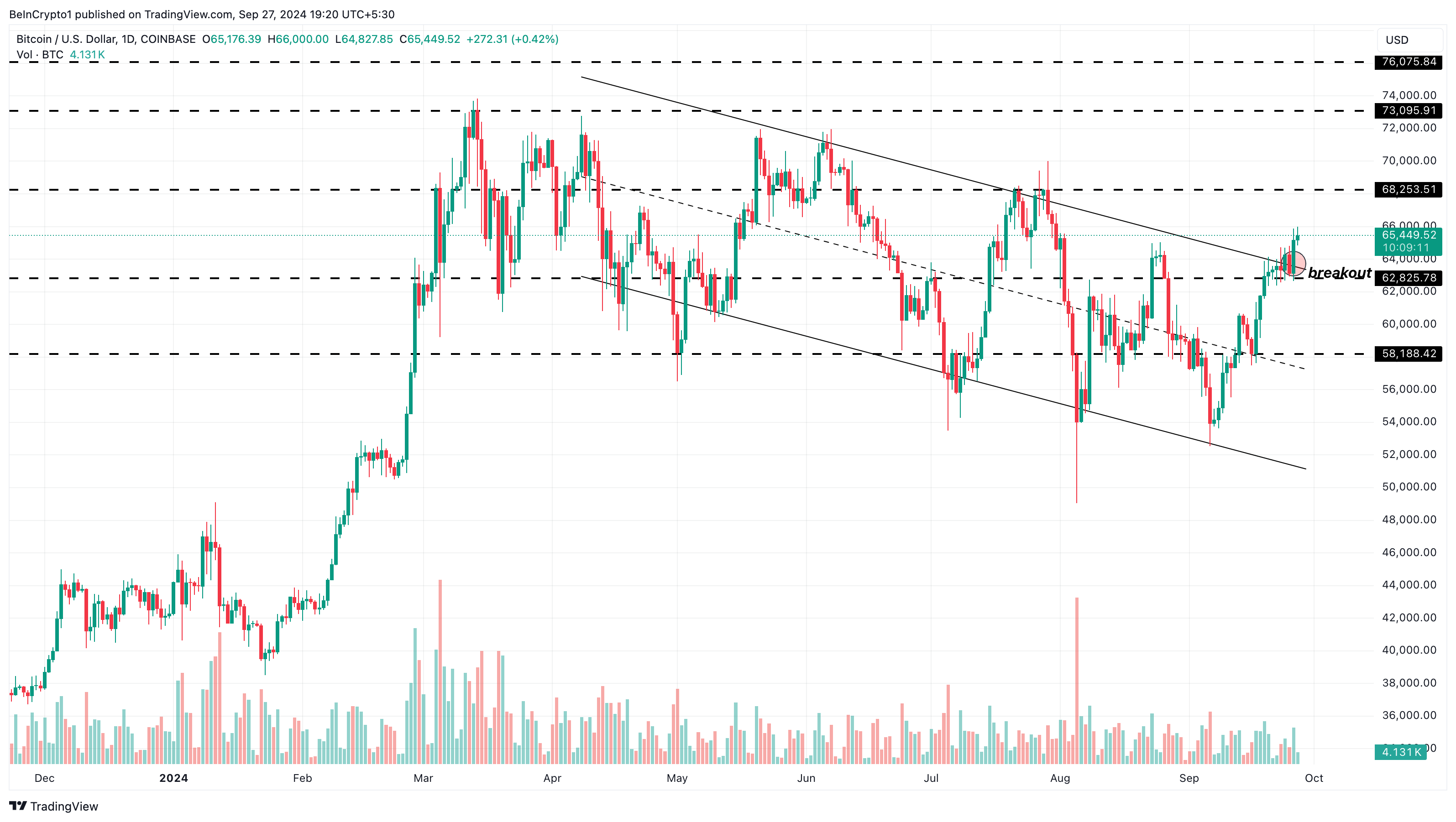 기술적 관점에서 볼 때, 비트코인은 마침내 하락 채널을 돌파했습니다. 7월부터 이 약세 패턴은 코인이 6만5000달러를 넘어서는 것을 제한했습니다.