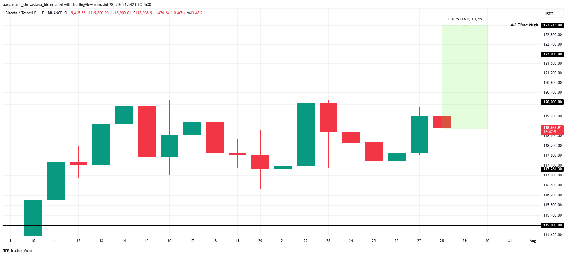 비트코인의 가격은 현재 11만8938달러에 머물러 있으며, 11만7261달러와 12만달러 사이의 조정 범위 내에 있습니다. 이 범위는 안정적이지만, 투자자 심리가 강하게 유지된다면 12만달러를 돌파할 가능성이 높습니다.
