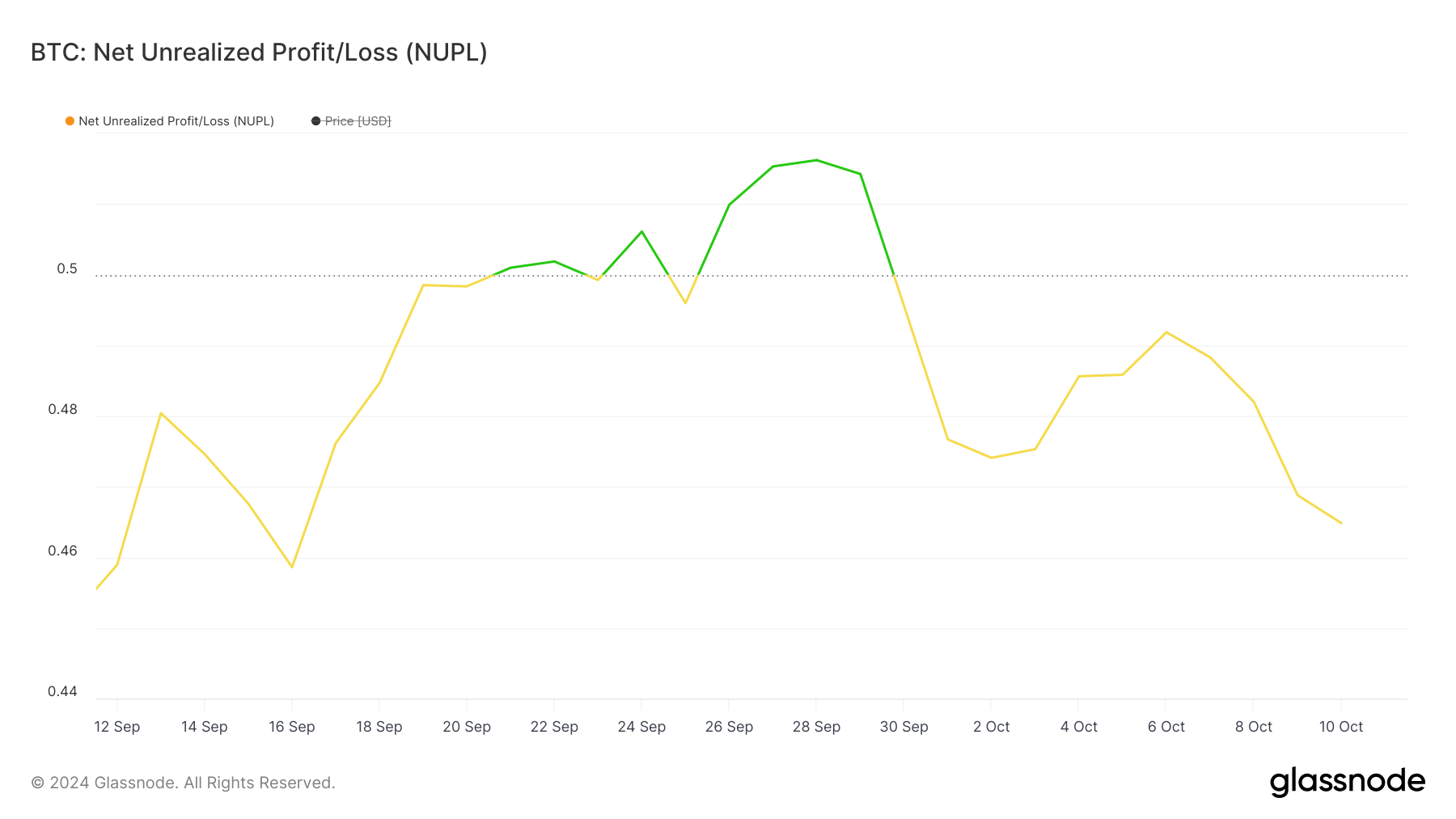비트코인의 순 실현 이익/손실(NUPL)은 지난 달 동안 주목할 만한 변동을 보였습니다. 처음에는 NUPL 지표가 상승하여 9월 말에 0.50을 넘어서 시장 참여자들이 이익을 보고 있음을 나타냈습니다.