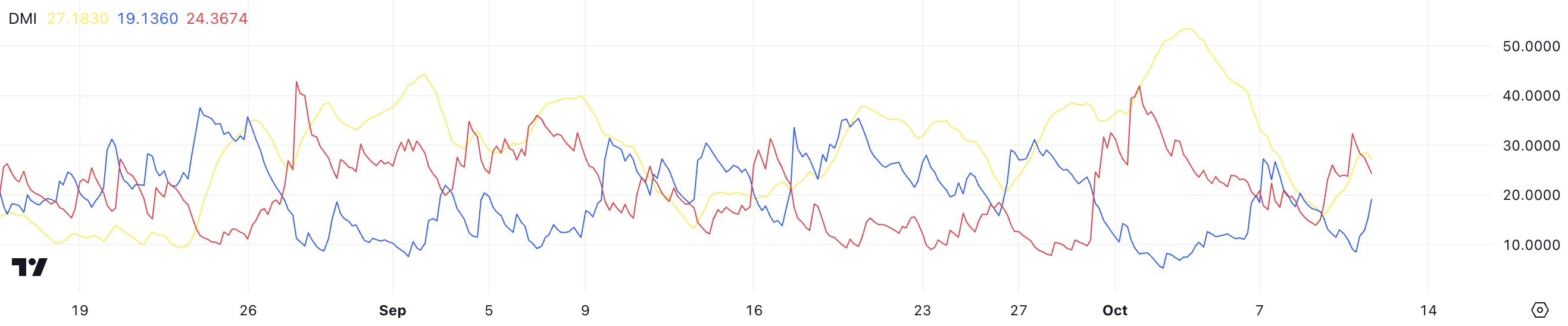이 변화하는 상황은 방향성 이동 지수(DMI)에 의해 포착되며, 이는 긍정적 방향선(+DI), 부정적 방향선(-DI), 평균 방향 지수(ADX) 세 가지 구성 요소를 포함합니다. 최근 상승하고 있는 노란색 선으로 표시된 ADX는 지배적인 추세의 강도를 측정합니다.