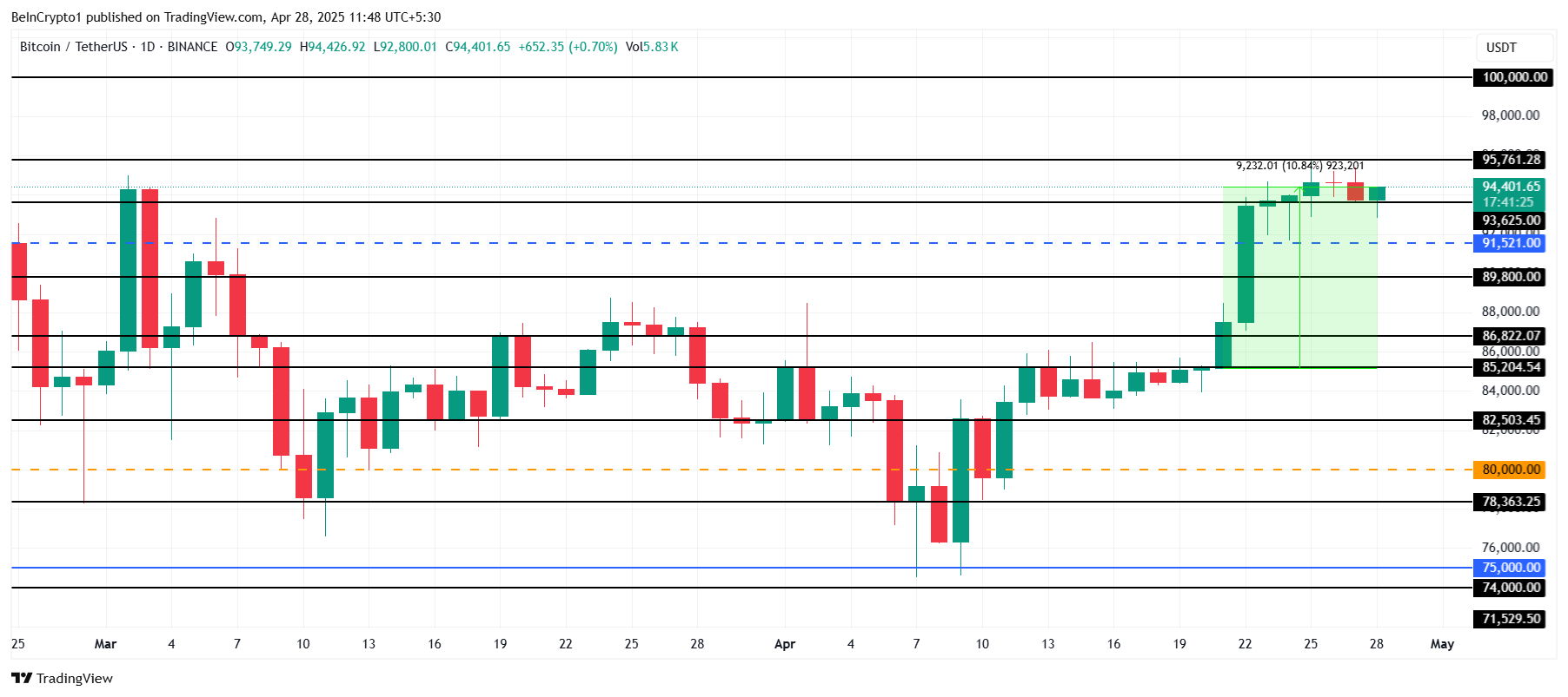 비트코인은 최근 주목할 만한 상승세를 보이며, 5주 이상의 정체 후에 가격이 9만달러를 넘어섰습니다. 현재 비트코인은 9만4401달러 부근에서 거래되고 있으며, 중요한 저항선인 9만5761달러에 근접해 있습니다.