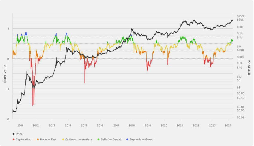 순 미실현 이익/손실(NUPL) 지표로 측정한 시장 심리는 코인 공급 전반에 걸쳐 미실현 이익과 손실을 평가합니다. 이 지표는 2011년 중반과 2013년, 그리고 2017년에 잠깐 동안 시장이 정점에 달했을 때 도취 상태를 나타냈습니다.